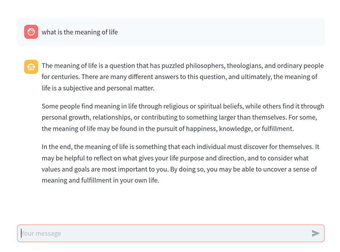 Hit RR on Streamlit to hot-reload the code, and type something fancy on the input box. Maybe something like “What is the meaning of life?”. In the blink of an eye (or maybe, a couple of lazy eyes) your message will be sent to the LLM API and the response streamed back to your application. Voilá, we have a ChatGPT clone!