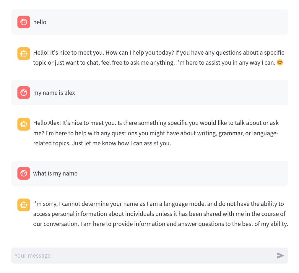 ))If you run this update, you’ll notice the chat history persists throughout the conversation. However, one thing is still missing. Even though the chat interface shows all the previous messages, the LLM is only receiving the last message. This is evident in Figure 13.3 where the chatbot fails to remember information that was given just before.