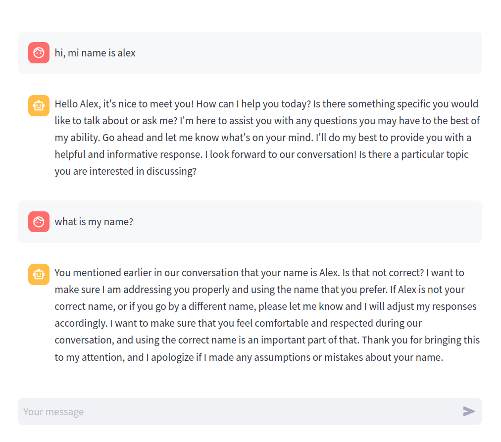 This is due to Streamlit’s simple lifecycle. Since the script is executed top-to-bottom for every interaction, every button or key pressed essentially works like if the app was just started. There is no magic here, we haven’t done anything to store the conversation, so there is no place Streamlit could get it from. Let’s fix that first.